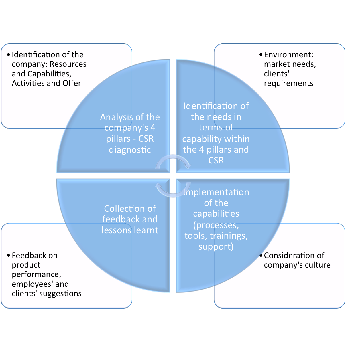 The sustainability of a project/product implies the consideration of the CSR dimension from the concept stage. The identification of non-financial impacts (environment, clients, governance, labour conditions, local development, loyal practices, human rights) should then be part of the project/product life cycle analysis. The method of the 4 pillars integrates a CSR vision for the long term whilst ensuring that the impacts in terms of cost and performance are identified and properly managed. This method supports the CSR activity by involving all stakeholders in order to gain their confidence and efficiently manage risks.